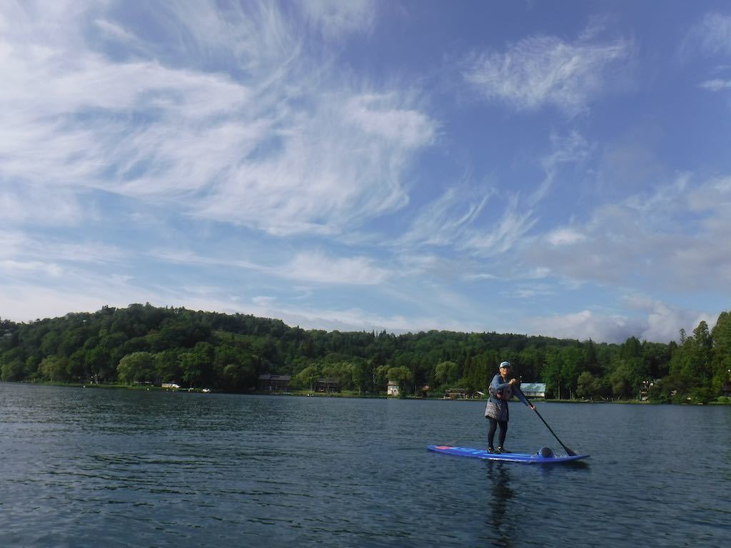 サップの上でのんびりするも良し、サップから野尻湖に飛び込んで水遊びするも良し!
